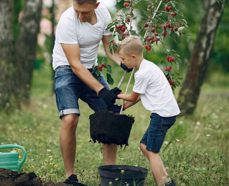 Direct na het aanplanten is het belangrijk om de boom ruim water te geven. Gebruik een emmer of gieter om de grond goed om de wortels te laten spoelen. Dit helpt om luchtbellen te verwijderen en zorgt voor een betere wortelhechting.